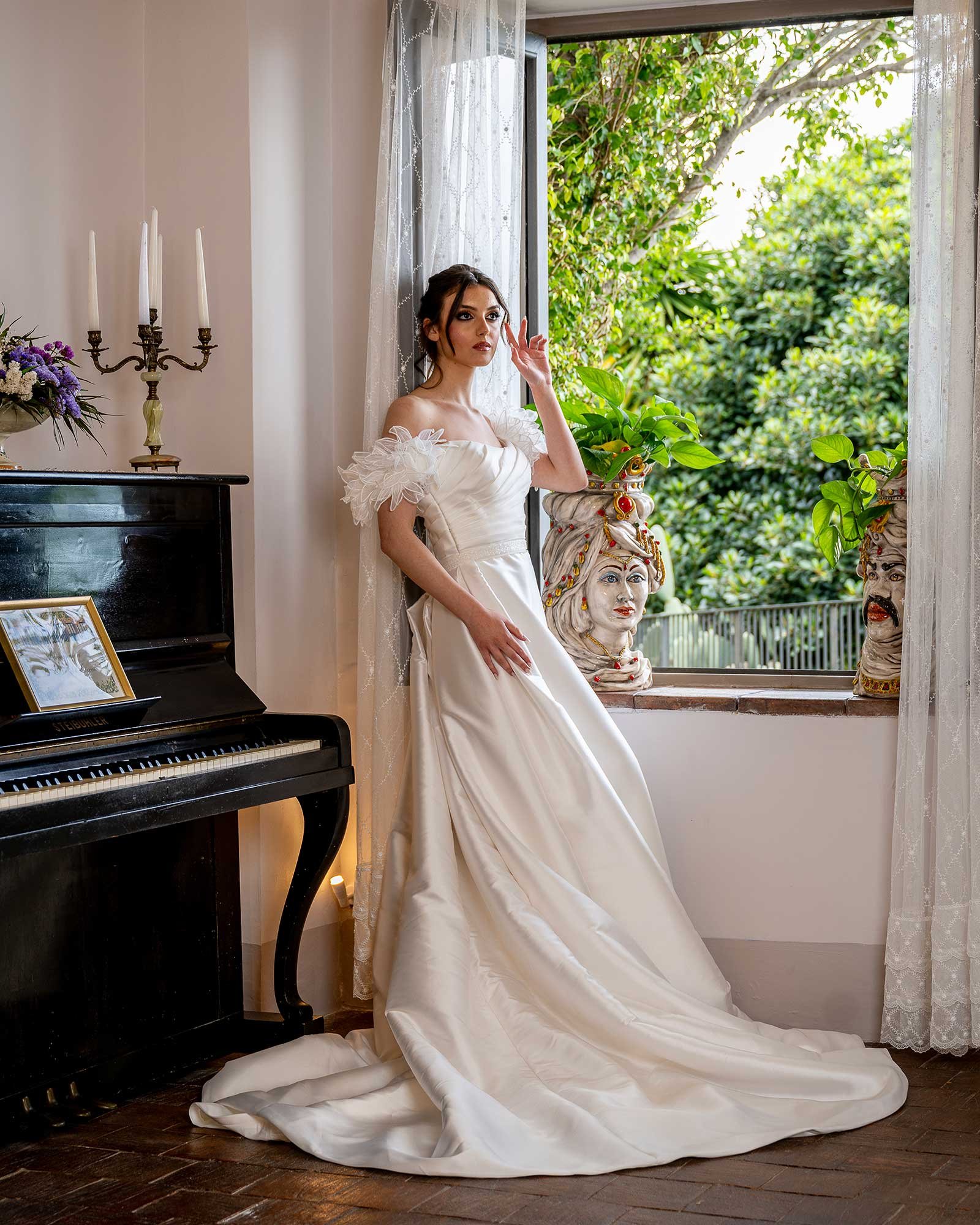 Abito principesco in tulle ricamato con fiori e foglie tridimensionali, linea ampia e leggera, scollo a barca e manichetta accennata. Il corpetto in raso organza di seta aggiunge luminosità e raffinatezza.