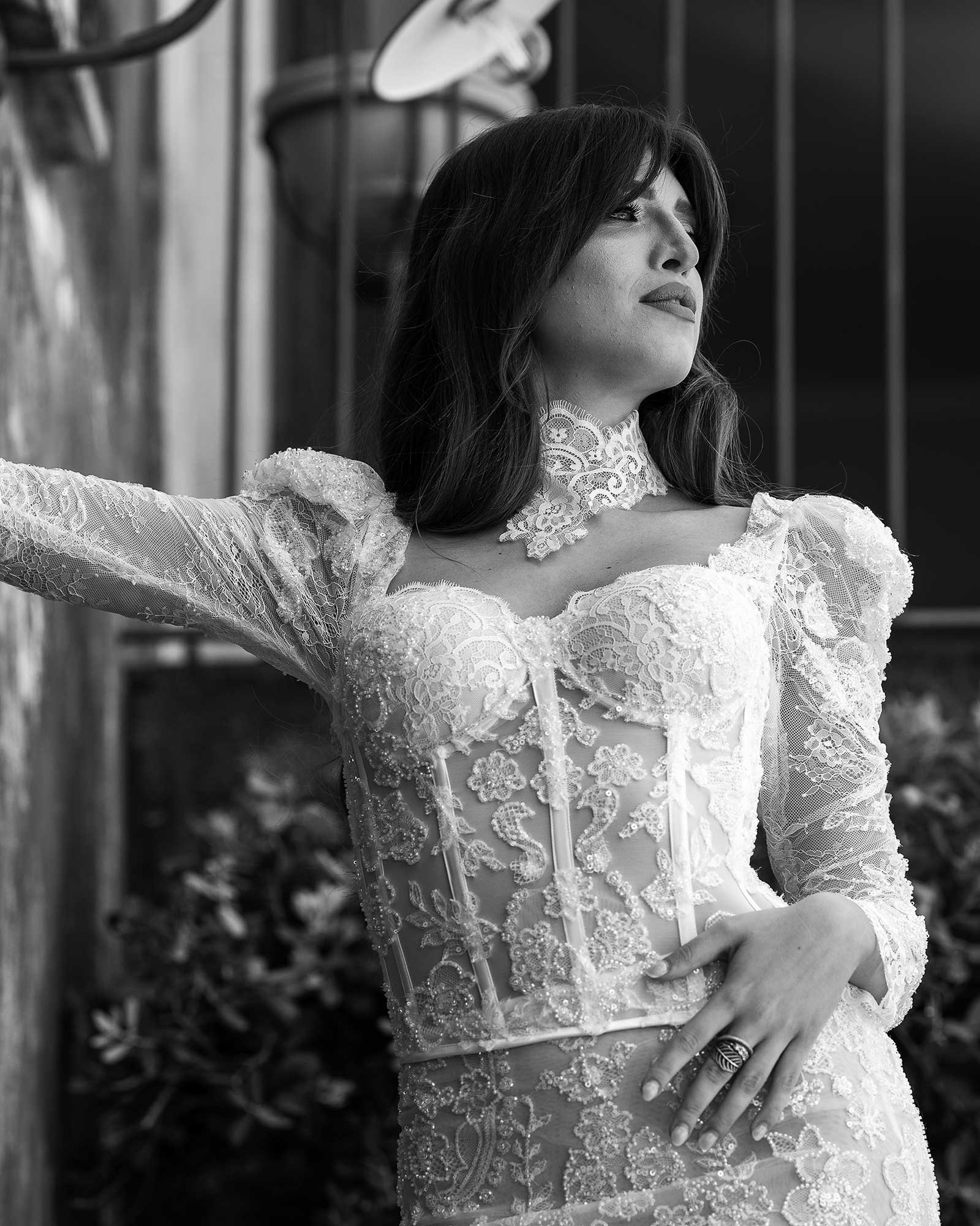 Un abito che gioca con volumi e trasparenze, trasformandosi con grazia tra eleganza regale e leggerezza fluida.