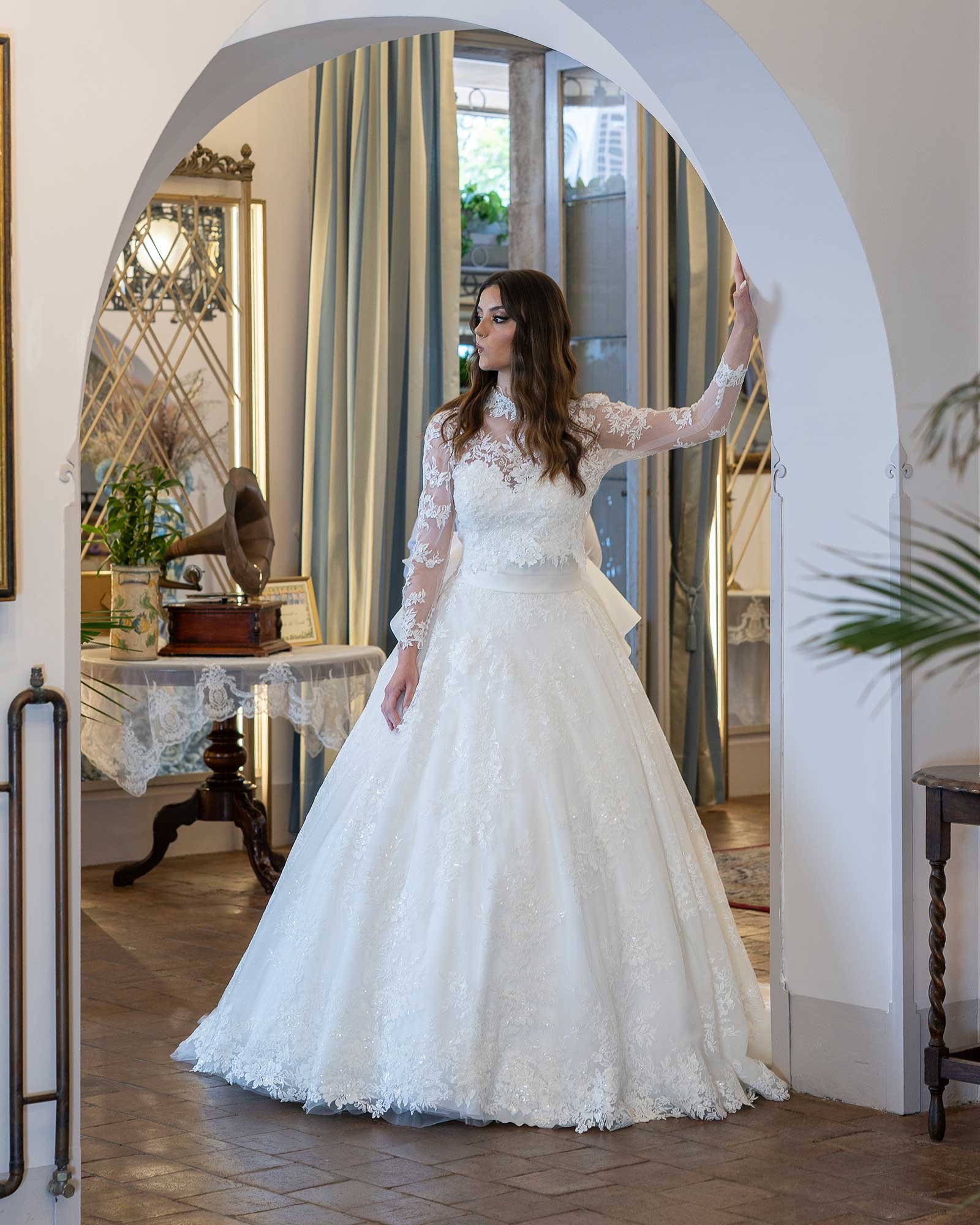 Abito principesco in tulle ricamato con fiori e foglie tridimensionali, linea ampia e leggera, scollo a barca e manichetta accennata. Il corpetto in raso organza di seta aggiunge luminosità e raffinatezza.