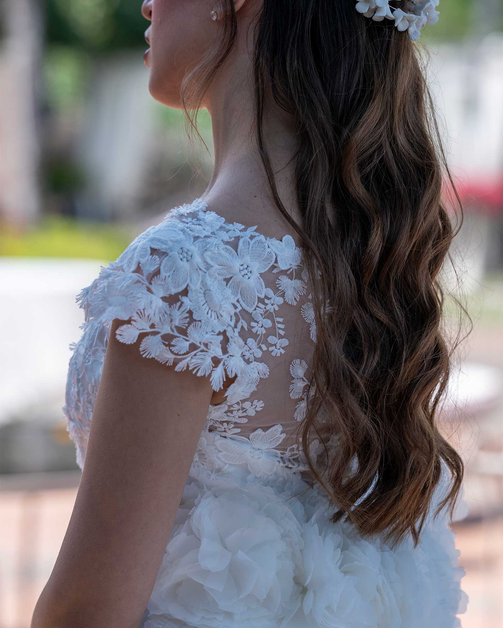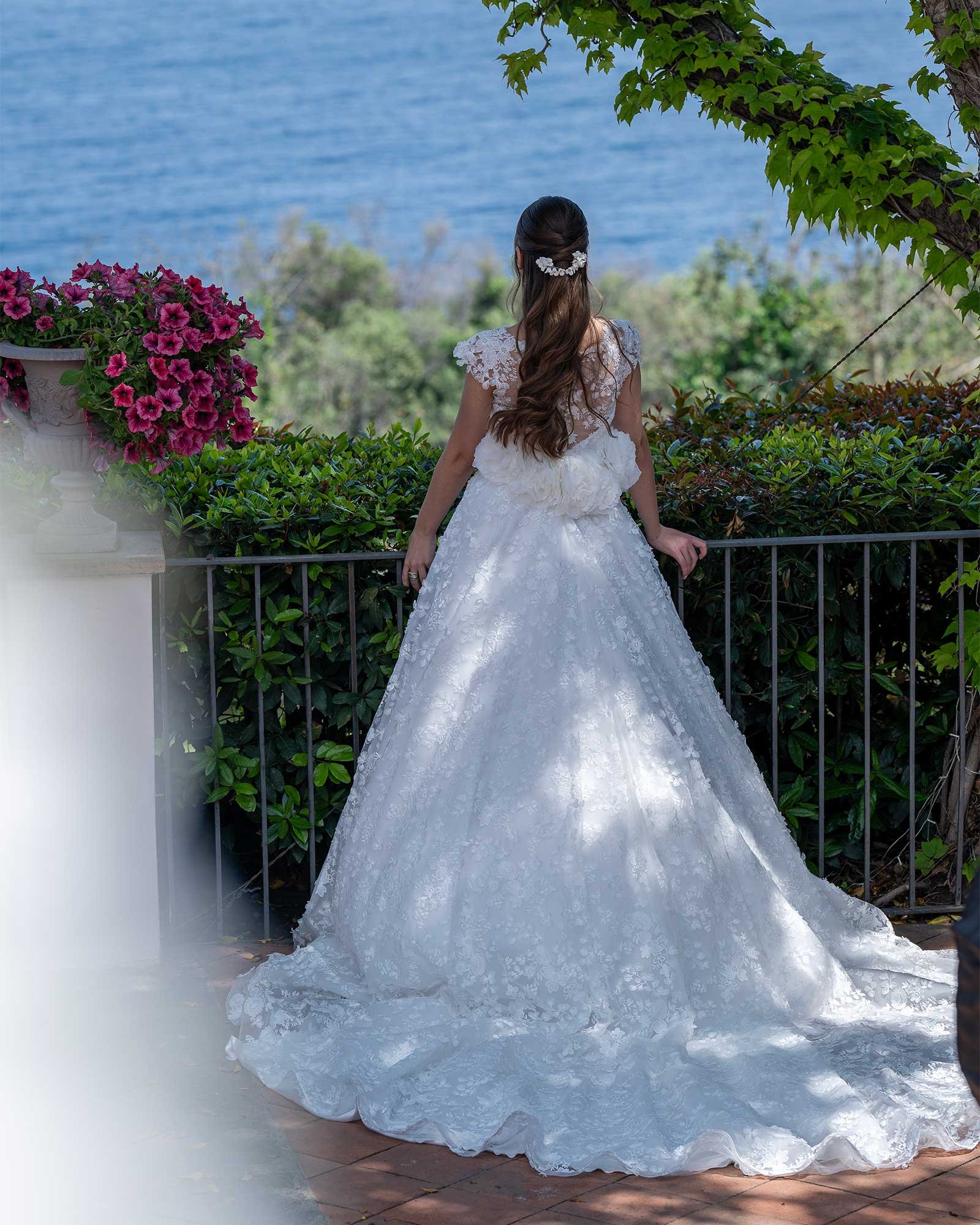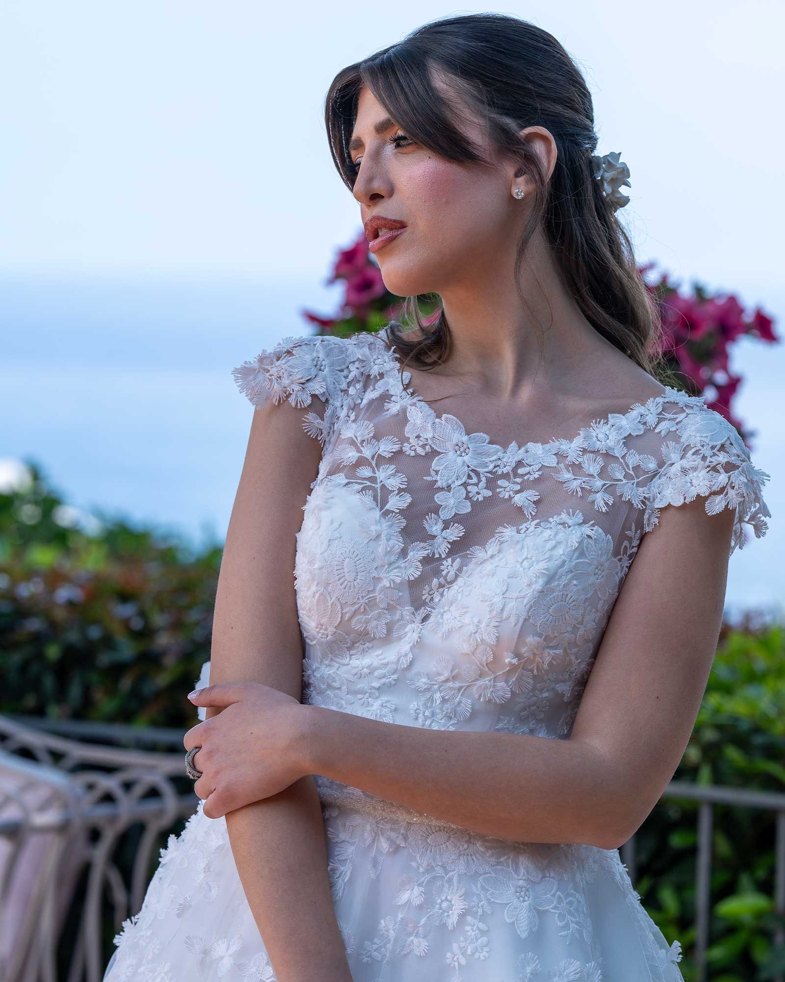 Un abito che racchiude l’anima romantica del Mediterraneo: fiori sospesi, luce di seta e un’eleganza regale che parla di grazia e artigianalità senza tempo.