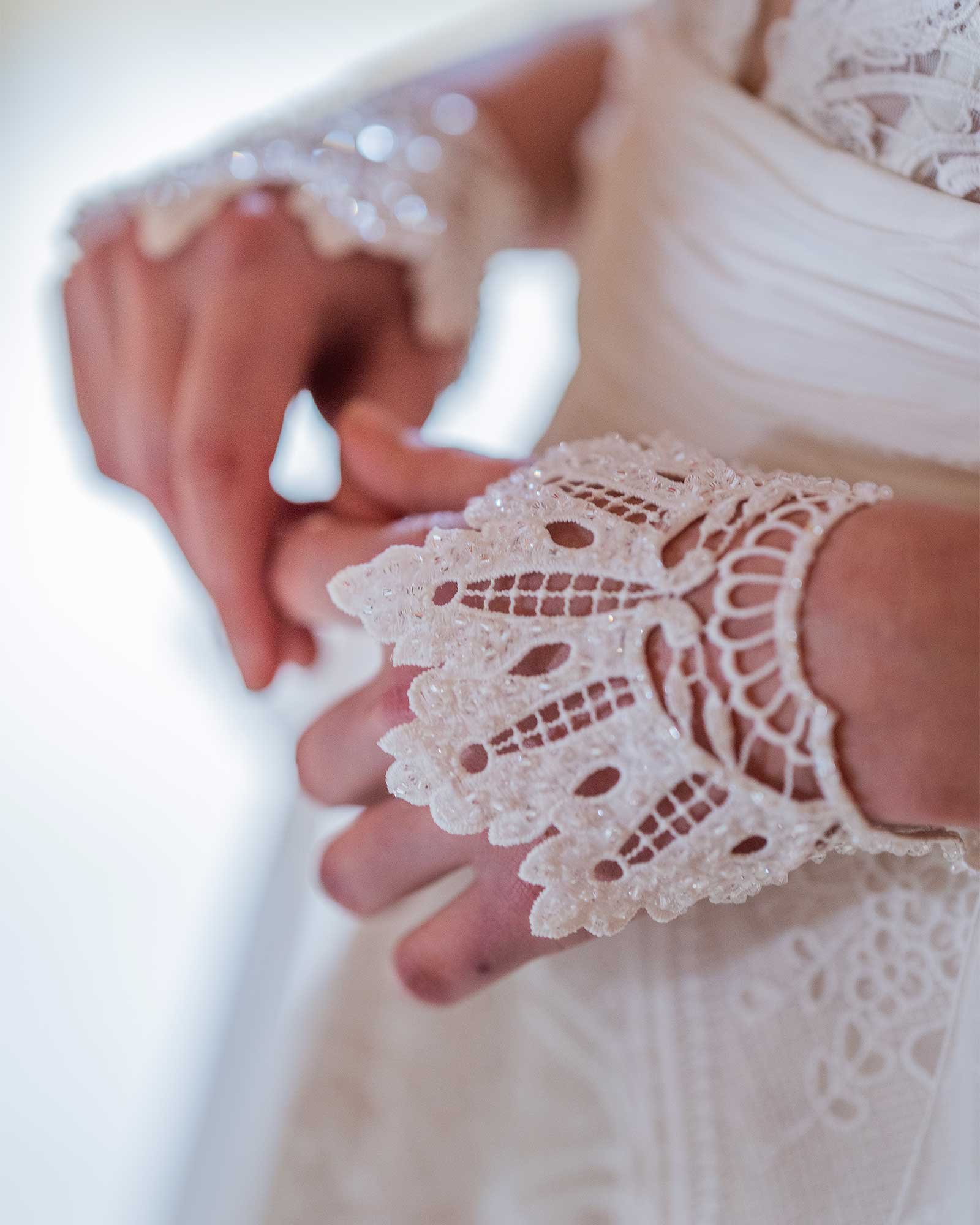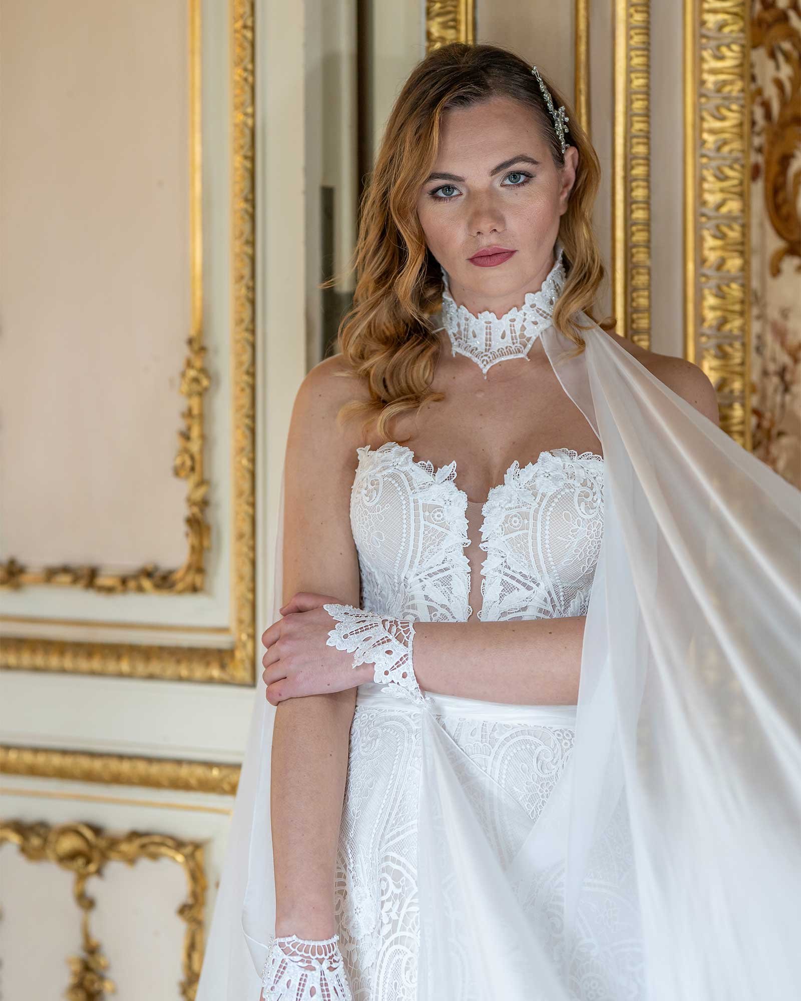 Abito sirena con bustino in guipure, gonna in tulle chantilly e coprispalle staccabile con maniche a sbuffo.