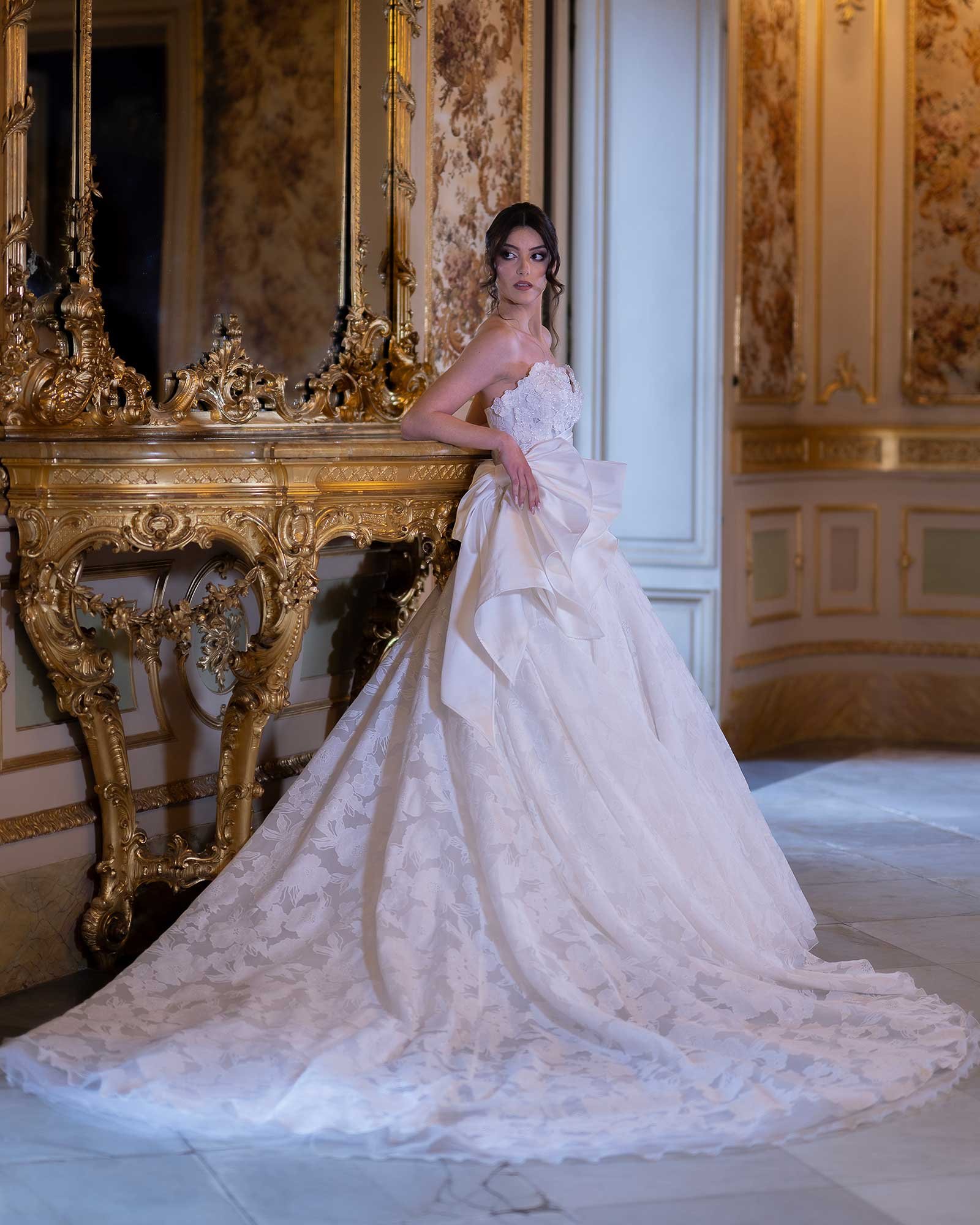 Un abito etereo che celebra la Sicilia, tra fiori sospesi e luce mediterranea, romantico e raffinato.
