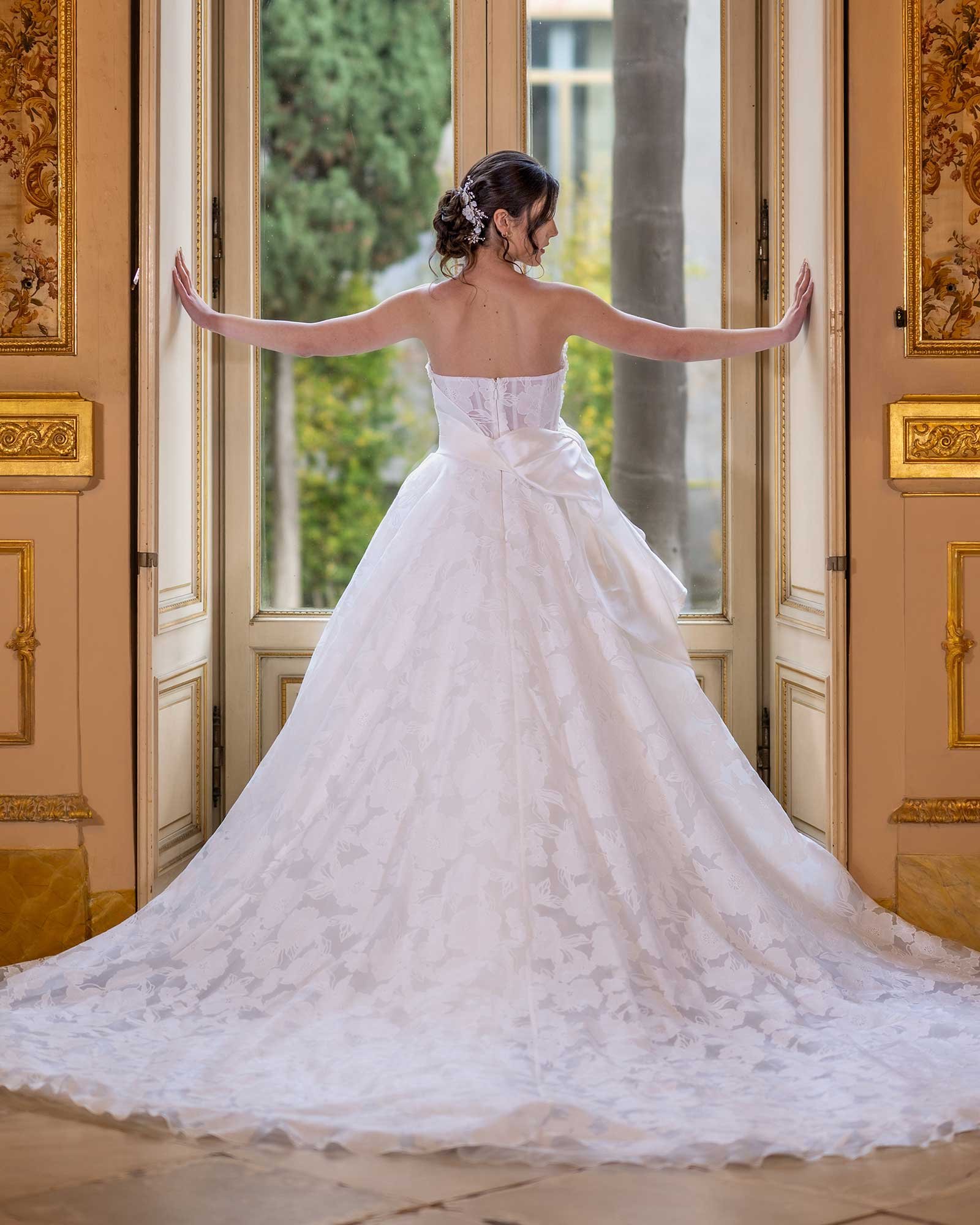Abito principesco con gonna ampia in tulle ricamato, corpetto a cuore in raso organza di seta, fiocco removibile e giacchino con collarino in tulle intarsiato.
